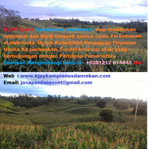 Jasa Appraisal Perkebunan untuk memudahkan Anda dalam mengelola dan memperluas aset Anda. Penilaian ini menangani kegiatan studi, penilaian, pengawasan, dan sensus tanaman, untuk berbagai jenis tanaman untuk menunjang berbagai macam tujuan dan kebutuhan perusahaan Anda. bisa penilaian di lakukan tujuan jual beli, Imbreng, Pengalihan saham, appraisal tujuan pengajuan kredit ke perbankan, Appraisal perkebunan tujuan lelang dan lain-lain. maka dari itu Jasa appraisal perkebunan harus memastikan tujuan penilaian itu di lakukan.
